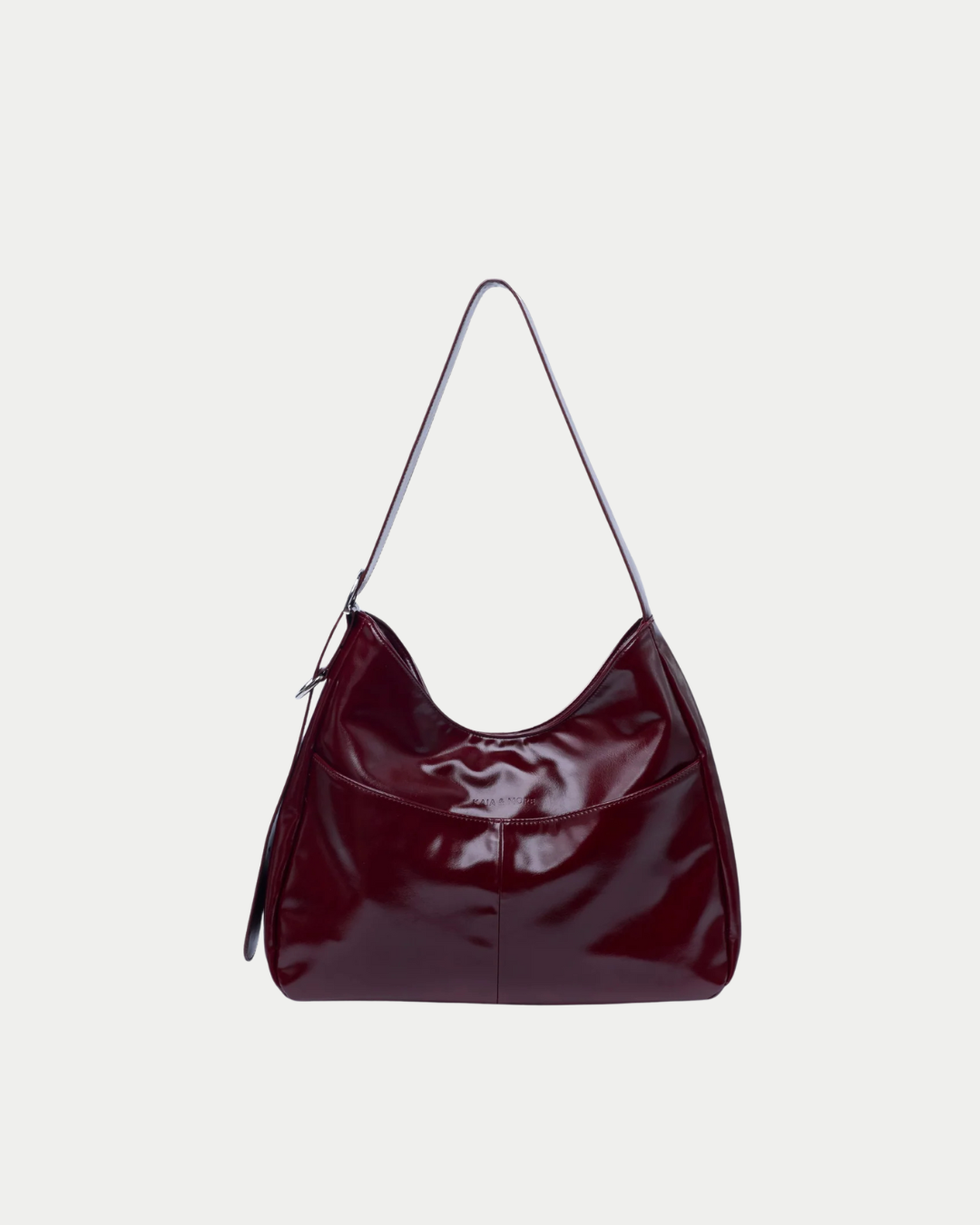 Large shoulder bag with a slightly rounded shape and sleek, subtle shine. Features a main zip compartment, spacious inner pocket with zipper, two smaller open pockets, and two exterior pockets with button closure.